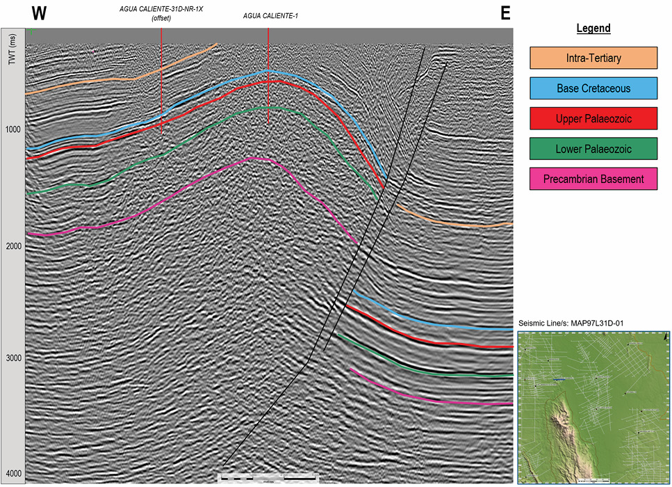 However, a second, more exciting prospectivity can be found below the Agua Caliente anticline and indeed below the thrust that formed it. The sub-thrust play is a common target in other parts of the Sub-Andean foreland basin regions along the East Andean margin from Colombia to Argentina (Fuentes et al., 2018). Depending on the depth and deformation of the decollement horizon, this sub-thrust play may be simply thrust-sealed or indeed have imbricate stacked targets in what is known as a ‘triangle zone’ below the thrust.