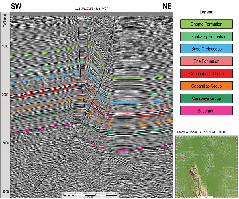 The analysis of a number of similar structures in the Ucayali Basin in a ‘Well Atlas and Play Analysis’ by Discover Geoscience, suggests it has not featured as a target in many wells in this basin so far, perhaps suggesting a remarkable opportunity exists across the entire basin. For example, the Aguaytia, Los Angeles and Neshuya structures to the west of Agua Caliente (and for that matter the La Colpa structure to the east of Agua Caliente) are all drilled on surface antiforms and do not reach the sub-thrust play. Whilst very clear on vergence parallel lines, some structures have subtle relief, requiring good seismic to correctly site valid tests. However, the more recent discovery of the Los Angeles field (2012) shows what can be done.