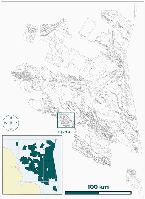 When zooming in over an area of interest (Figure 3) even more detailed structural information is revealed, and by comparing it to gas fields such as Lancelot and Excalibur it is possible to get a sense of scale. By looking at Figure 1, it is clear that this is just a postage stamp of an area on a rather large envelope. However, the detail observed when the fault confidence volume is rendered in 3D is quite spectacular. The complex nature of the faulting is brought out in all of its glory, making subsequent interpretation far more accessible and informative. As we whittle the volume down to that of a development style project, the need for a detailed interpretation does not change; if anything, it becomes even more important. Now that the petroleum system is defined and the highest calibre traps identified, it is all about getting the hydrocarbon fluids out of the ground safely. In doing so, interpretation will become even more focused on fine detail – where the presence of even the smallest fault can play a significant role in fluid transmissibility or reservoir compartmentalisation.