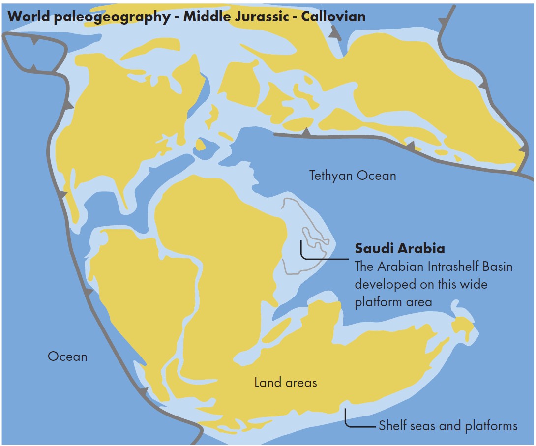 These early Late Jurassic (Oxfordian) source rocks of the Lower Hanifa Formation were deposited in what is described as the Arabian Intrashelf Basin. This basin formed on the eastern margin of the Arabian Platform, facing the Tethyan Ocean.
