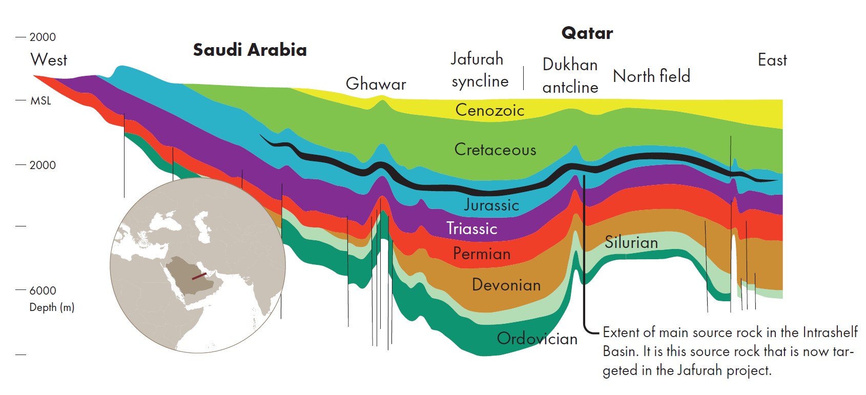 The Jafurah ‘basin’ play is within the broad synclinal trough between the Ghawar anticlinal trend and the Dhukan anticlinal trend, structures formed during the Tertiary when the Arabian Plate collided with the Eurasian Plate. The Jurassic interval of interest formed at the Middle and Late Jurassic boundary within the Arabian Intrashelf Basin. To find out more about the geology of the Jafurah basin, I travelled to London King’s Cross to meet with Augustus (Gus) Wilson in a café not far from the station.
