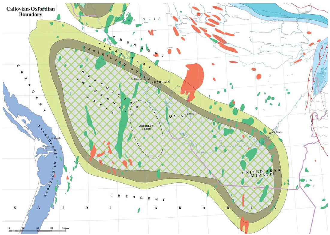 The Arabian Intrashelf Basin facies are underlain by regionally extensive and exceptionally uniform platform carbonates belonging to the Dhruma Atash Sequence, deposited across the Arabian Platform during Late Bathonian to Early Callovian times. As Gus describes in his book, it is hard to interpret the origin of such a flat, regionally extensive interval of similar facies.