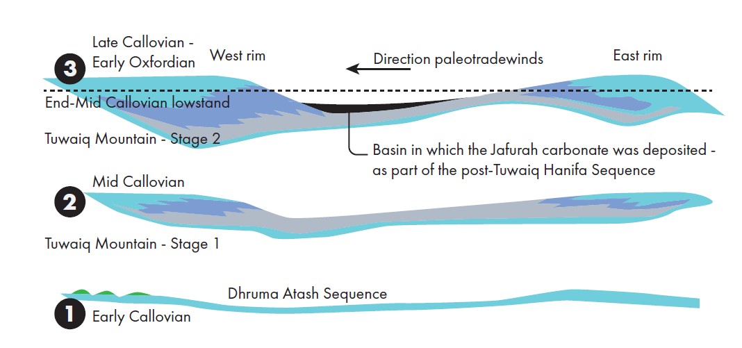 The Tuwaiq Mountain sequence of shelf progradation was probably terminated due to a global lowstand at the end of the Callovian. It is during that lowstand system in which the source rock that is now targeted by the Jafurah wells was deposited.