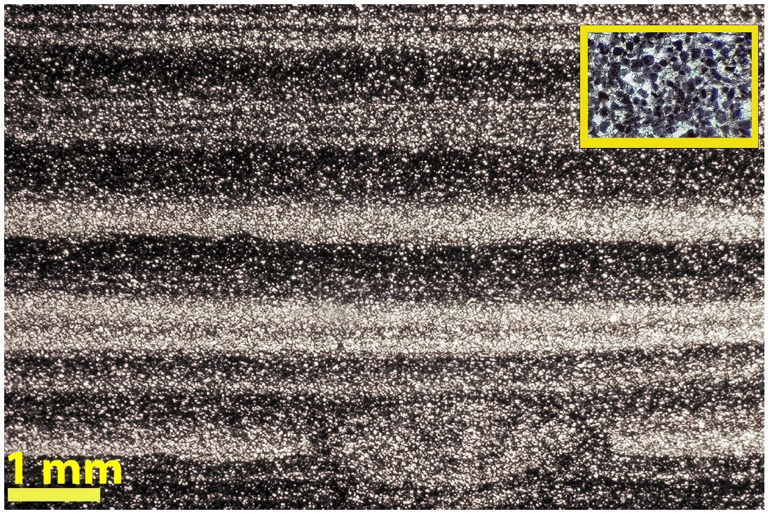In contrast to what some people think, the source rock is not a shale, but a carbonate. To be more precise, it is a very organic-rich laminite, characterised by the alternation of light-coloured laminae of micropeloidal micrograinstone and dark organic-rich carbonate laminae. The light-coloured laminae show what can be interpreted as small-scale scouring, which may indicate reworking of the peloids by bottom currents. Gus adds that he has never seen a similar facies during his 50-year career working with carbonates of very different ages, although he does write that others have found such facies elsewhere.