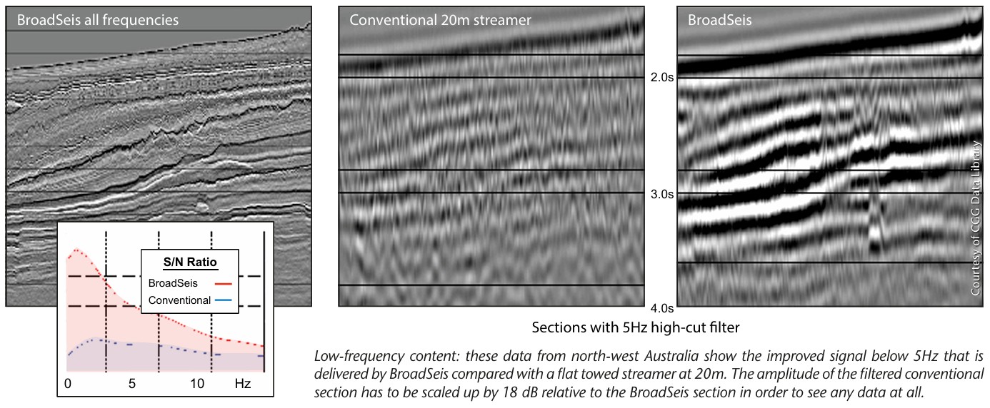 Conventional marine streamer acquisition usually lacks sufficient signal-to-noise ratio in the 2–7 Hz bandwidth due to streamer depth, streamer tow noise, source array configuration, source depth and source bubble. Using BroadSeis, it is possible to routinely record frequencies with good signal-to-noise ratio down to 2.5–3 Hz, providing three octaves below 20Hz as shown in the figure below.