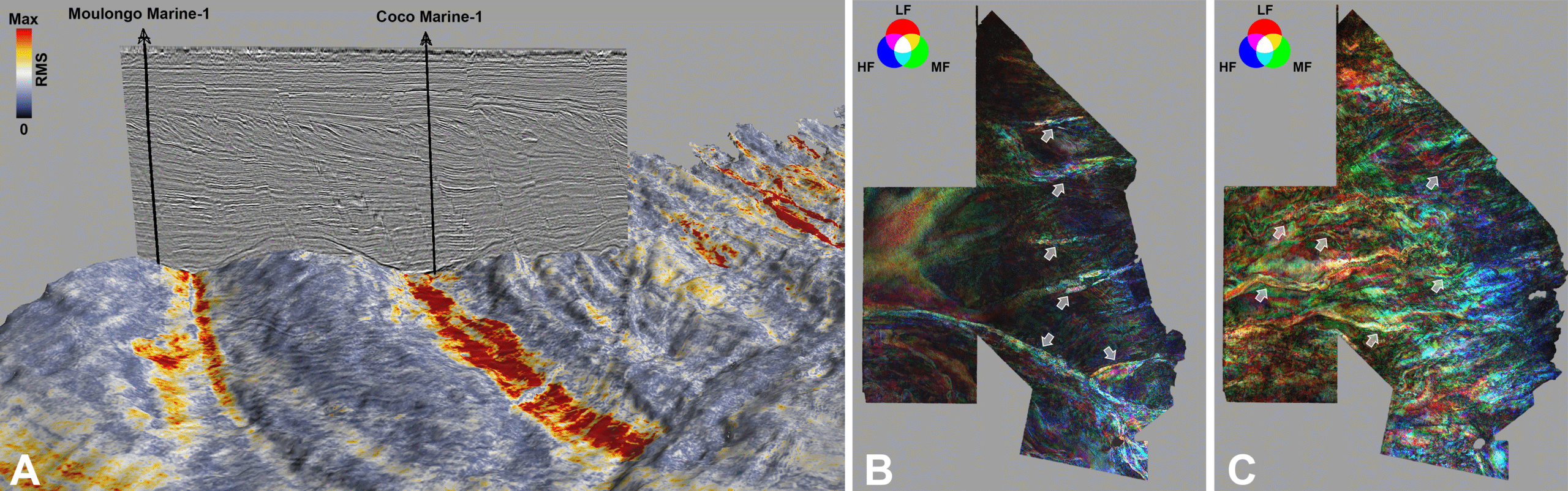 The new interpretation of the reimaged 3D data has highlighted significant prospect potential within Cretaceous and Tertiary plays. In the Ntem and Elombo blocks, refined PSDM imaging and attribute analysis reveal deeper, potentially sand-rich targets that have previously gone untested in earlier campaigns. Multiple large-scale stacked Upper Cretaceous channel systems and associated stratigraphic traps are now clearly defined (Figure 1). Spectral decomposition and high-resolution seismic attributes (Figure 3A) reveal large compound channels with strong amplitude contrasts and depositional geometries that indicate potential for sand-rich fills and promising trapping configurations (Figure 3B).