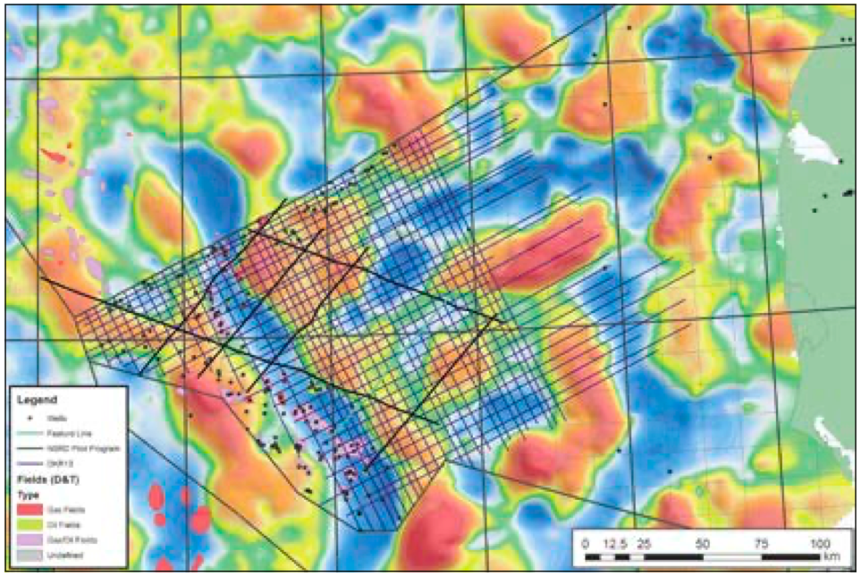 This article focuses on the areas of the Danish sector which are considered to be most prospective, yet largely underexplored. The map on the right shows the pilot programme location and current distribution of wells, discoveries and producing fields overlain on the satellite gravity data. It also shows the newly acquired DKR13 long-offset survey currently being processed ahead of the 7th Danish Licensing Round announcement.