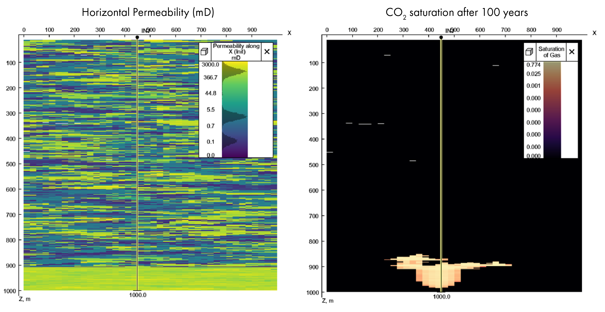 “One of my key learnings was that our modelling suggests that the risk of CO2 coming up all the way to surface is, in fact, negli­gible,” Mark says. “Look at this cross-section,” he continues, and he points to a model of just a single 100 m reservoir with a 900 m thick overburden consisting of a mix of lithologies that do not form a perfect seal. “Even in such an extreme case, where we don’t have a perfect seal,” he explains, “we don’t see CO2 migrating to surface in a matter of 100 years, as most of the CO2 would have dissolved in the formation water by that time.”