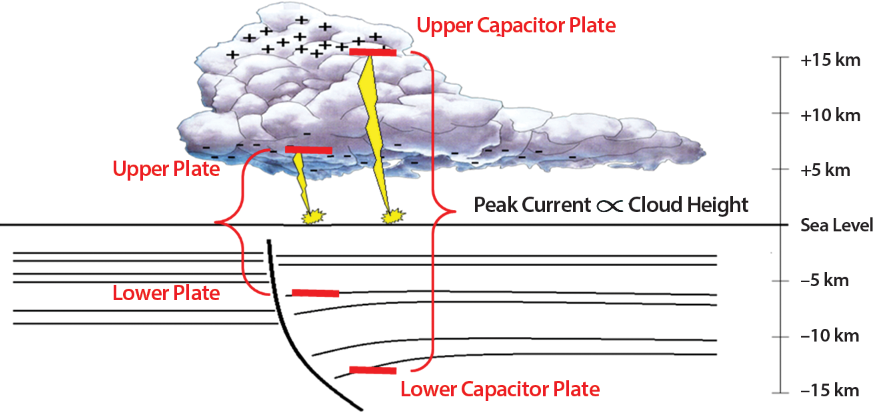 Treating the atmosphere and the earth as a capacitor, the charged thunder cloud can be considered one plate, while the other is the earth underlying the charged cloud. The dielectric is the insulating medium between the capacitor plates that transmits electrical force without conduction; namely the air and the earth, between the atmospheric static charge build-up and the interacting and oppositely charged currents in a different part of the thunderclouds (C2C strokes) or telluric currents at depth (C2G strokes). Dynamic makes two assumptions: firstly, lightning occurs when there is sufficient charge to bridge the capacitor; and secondly, lightning is affected by geology to a depth proportional to the cloud height, as estimated from the Peak Current of the stroke. We recognise it is hard to accurately measure the height of a lightning stroke, and that the lightning strike itself, lasting microseconds, is a small part of the electrical interaction between the atmosphere and the lithosphere.