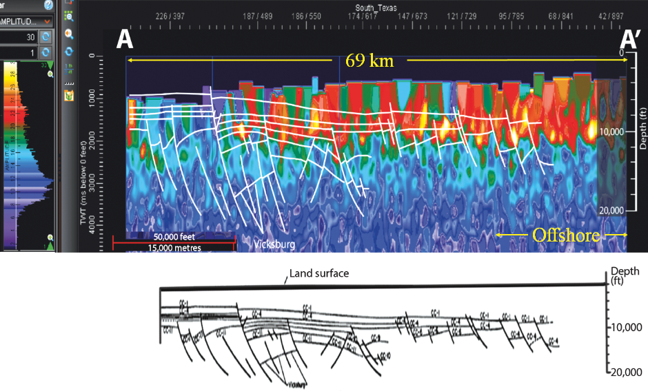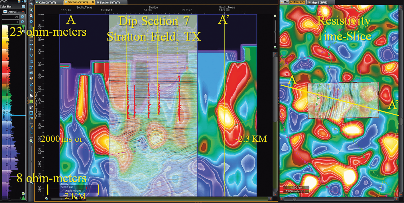 Here is a cross-section and a horizontal slice through the Stratton Field taken from about 30 km west of section A–A’ in the previous image. In this display the seismic data released by the BEG is semi-transparent, revealing the apparent resistivity underneath. A Vicksburg expansion fault (dashed green line) is easy to see on the seismic data: note how well the resistivity volume maps this fault out from the seismic control. The fault can also be seen on the 2,000 ms time-slice on the right.