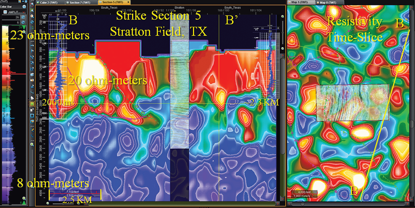 An apparent resistivity cross-section from south-south-west to north-north-east cutting the south-east corner of the Stratton 3D seismic survey is shown below. This cross-section connects two deep resistivity logs, demonstrating how well the 20 ohm-metres recorded on the well log matches the 23 ohm-metres shown on the apparent resistivity colour scale on the left.