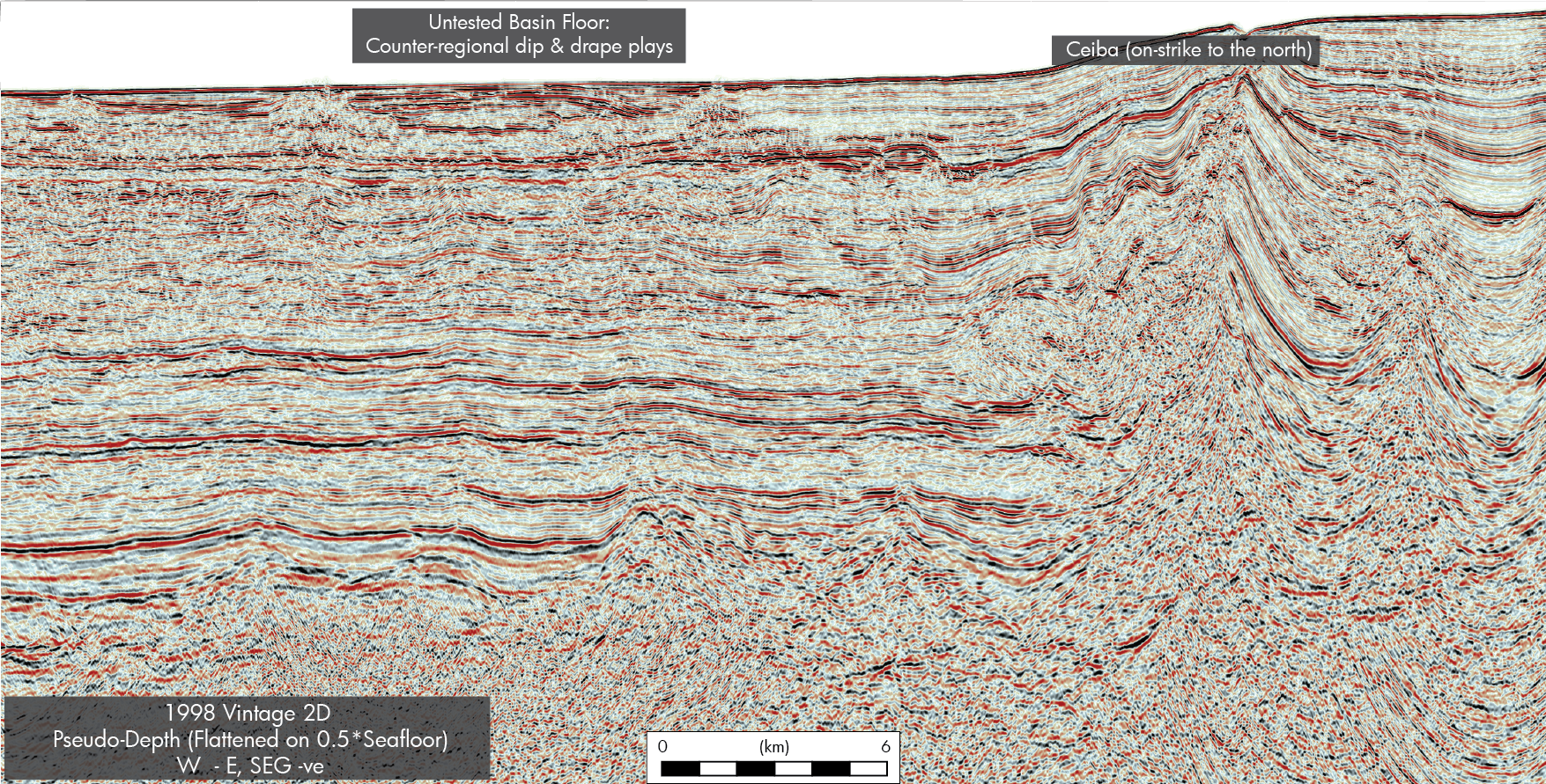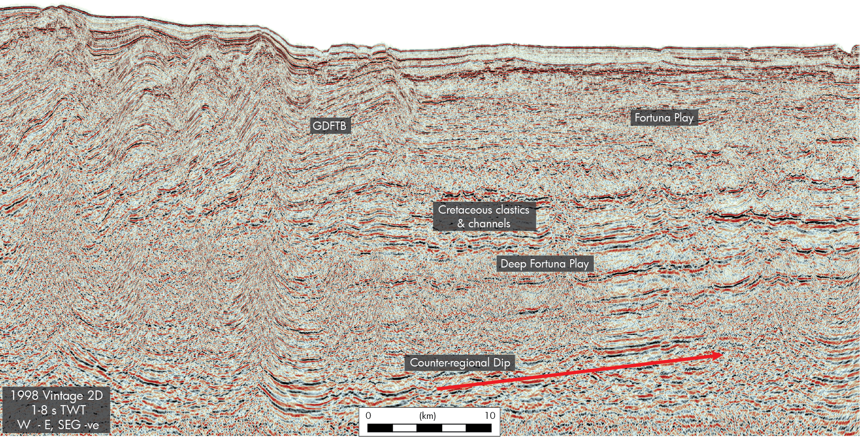 However, Fortuna and the appraisal wells not only confirmed a syn-GDFTB Mid-Miocene play, but crucially also encountered underlying Upper Cretaceous sands that pre-dated the GDFTB. This is a significant observation as it proves that pre-GDFTB and pre-CVL intrusion, offshore EG was a deep basin floor, not only accumulating sands from the NE and SE but also accumulating Cretaceous basin floor fans and aggrading channel systems from the Niger Delta in the north. Don’t doubt that sands can get this far – they are penetrated in the Fortuna wells and comparable to many other examples of sands travelling huge distances, for instance from Senegal to volcanically inverted Maio in the Cape Verde Islands. This is an incredibly important play as the basin’s structural dip caused by the Tertiary CVL puts the Cretaceous basin floor fans into large and as yet untested counter-regional dip traps between the GDFTB and the CVL.