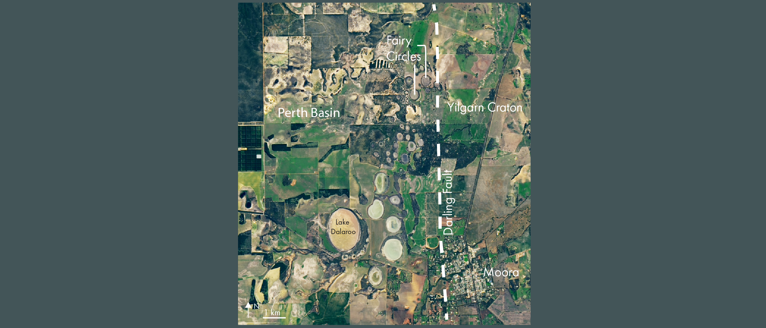 In the satellite image shown here, we see the many fairy circles near the town of Moora, located 150 km north of Perth in Western Australia. The fairy circles, locally known as salt lakes, vary in size from tens of meters to over a kilometre in diameter. They form a band along the eastern edge of the North Perth Basin, separated from the Yilgarn Carton by the Darling fault.