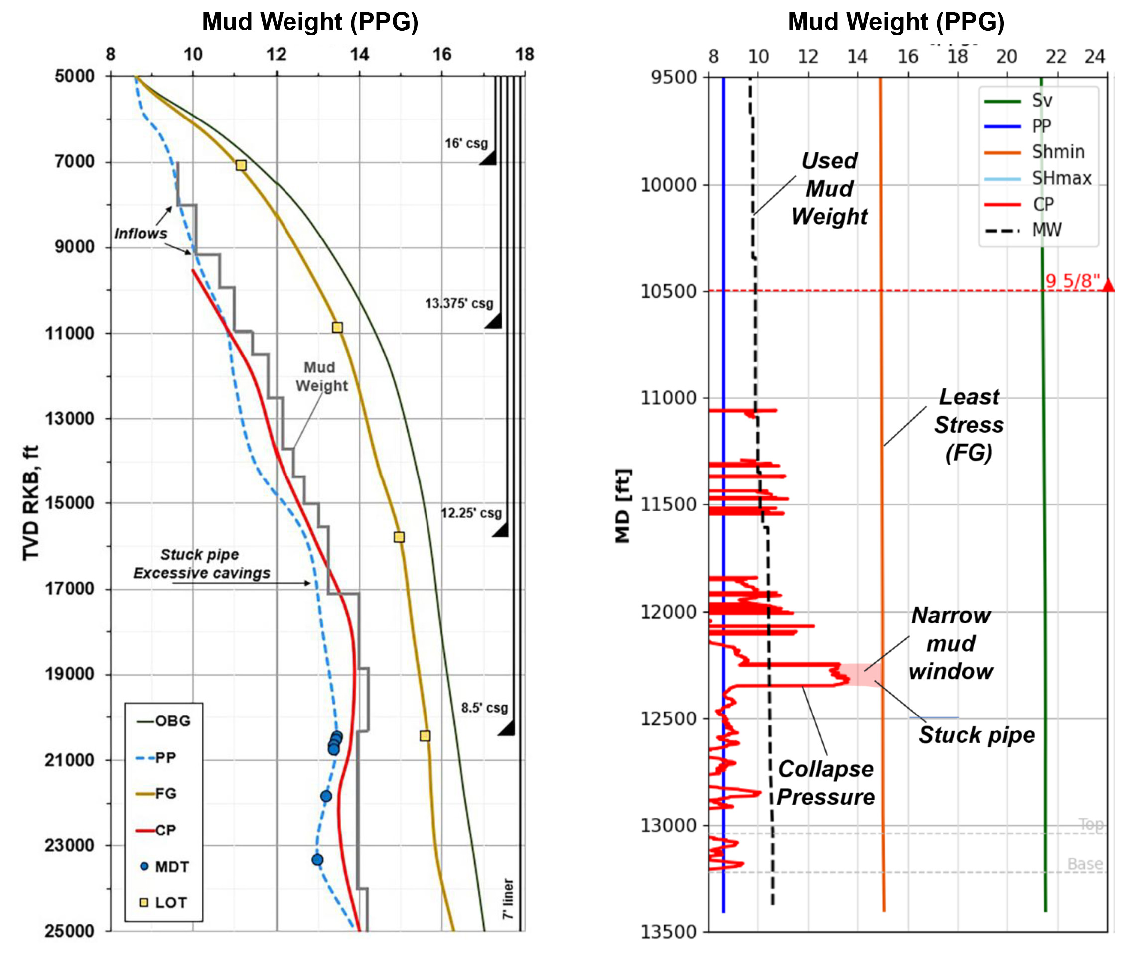 Left: Schematic illustration of a mud window. The used mud weight (MW, grey) trends close to collapse (CP) and pore pressure (PP). When PP exceeds MW, inflows are reported, while when CP > MW, wellbore instability is evidenced by the reported excessive cavings and stuck pipe events.  Right: A detail of a narrow drilling window around 12,300 ft. Here the difference between CP and fracture gradient (FG, defined as Shmin) is ~1.5 ppg. A MW of 13.5-15 ppg would be required to ensure instability. Instead, a 10.5 ppg MW was used, resulting in wellbore failure and a stuck pipe event.