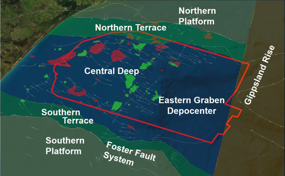 The offshore area of the Gippsland Basin is flanked to the north by the Northern Terrace and the Northern Platform. To the south, the basin is bounded by the Southern Terrace and the Foster Fault System. The central basin area comprises the Central Deep, which hosts all of the major fields. To the east of the Central Deep lies the Eastern Graben Depocentre, beyond which exist large structural highs that compartmentalise the deepwater areas.