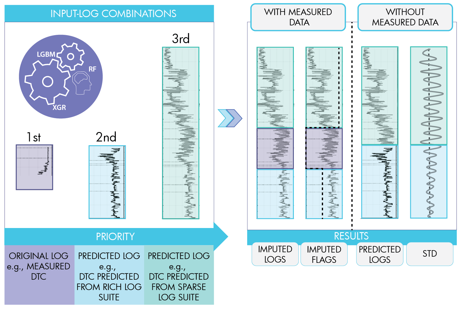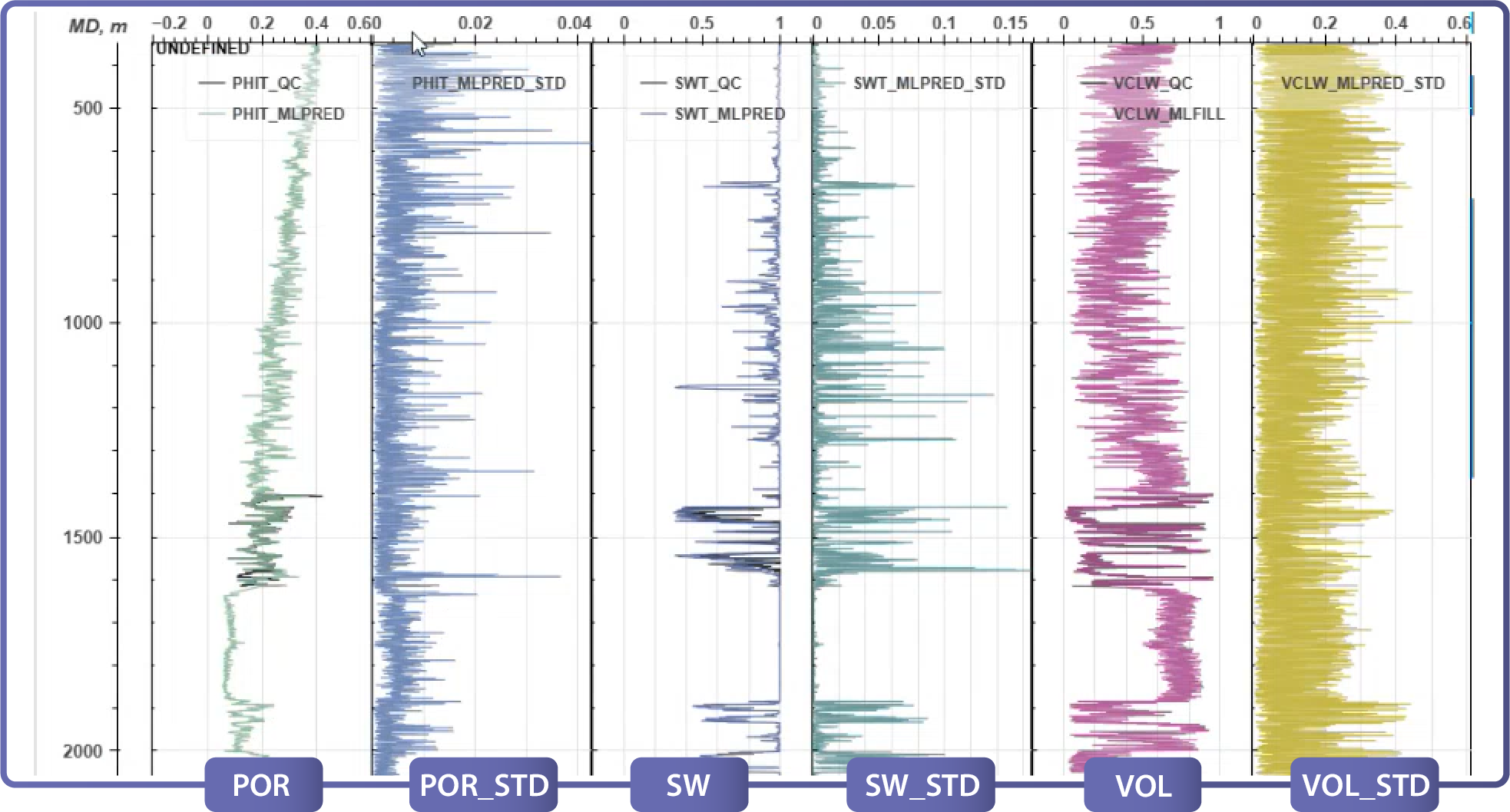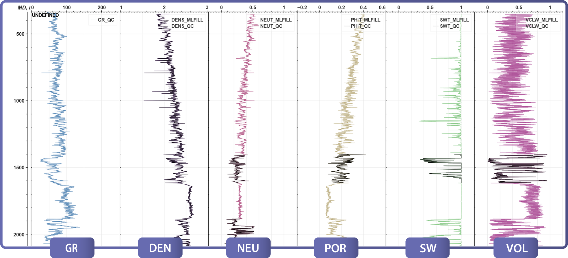 - Gap Identification: Recognizing missing log intervals in key measurements such as sonic (DTC, DTS), density, neutron porosity, and reservoir properties (porosity, water saturation, and clay volume).