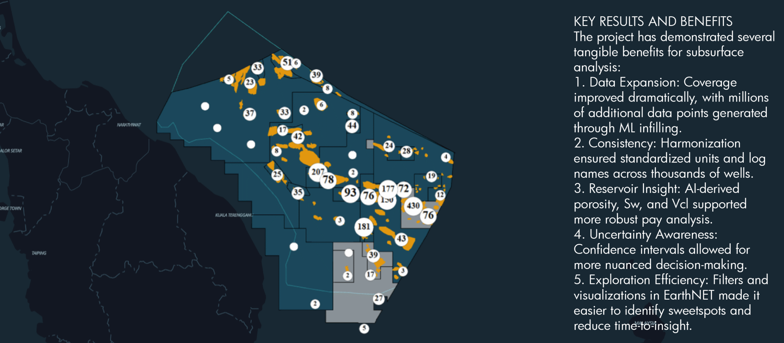 By integrating PETRONAS myPROdata with EarthNET and applying AI-driven subsurface analysis, this project has shown how machine learning can transform traditional workflows. From harmonizing thousands of wells to predicting missing logs and quantifying reservoir properties, the approach significantly accelerates exploration while maintaining rigor and transparency. Ultimately, the initiative demonstrates that AI is not just a tool for automation, but a partner in discovery — helping turn well data into the next hydrocarbon opportunity in East Coast Peninsular Malaysia.