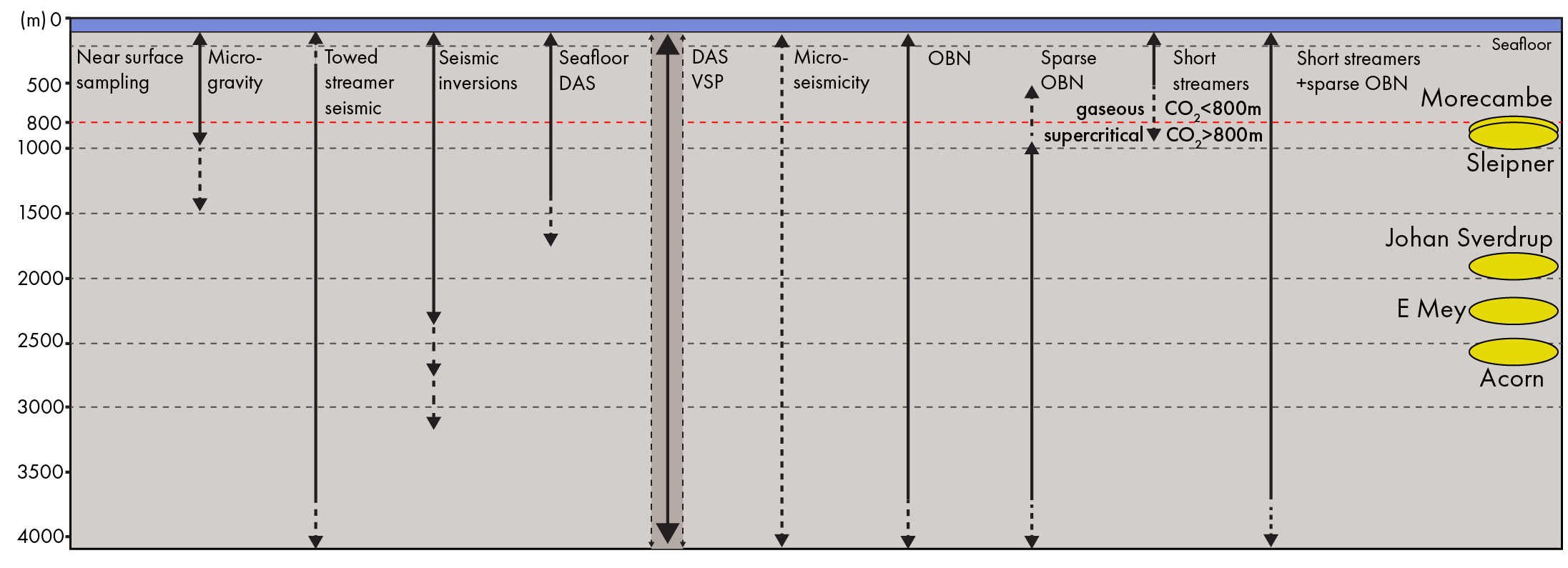 For example, gravity monitoring may offer partial assurance in an area of wind farm and CCS overlap at Morecambe Net Zero (EIS; Sherwood Sandstone reservoir, 700-1,100 m), but exponential decay of signals with depth sees gravity as unsuitable for the deeper Cretaceous Captain and Cenozoic Mey sandstone reservoirs at 2,200-2,500 m in the Acorn and East Mey stores of the OMF. Similarly, microseismic surveys may identify and locate seal failures but cannot adequately image CO2 migration in typical reservoirs.