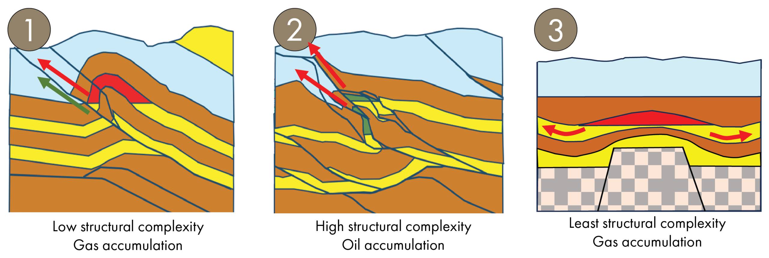 Therefore, areas of lesser complexity, such as the thick-skinned deformed part of the Papuan Basin foldbelt (1), tend to be prone to gas-only accumulations with the oil having been displaced. The more structurally complex thin-skinned deformed part of the foldbelt (2) tends to also host oil accumulations, as some or all of the gas leaks through the faults, creating space for the oil. The foreland part of the basin (3), which is the least structurally complex setting, contains only gas accumulations of relatively low column heights that do not favour the accumulation of oil.
