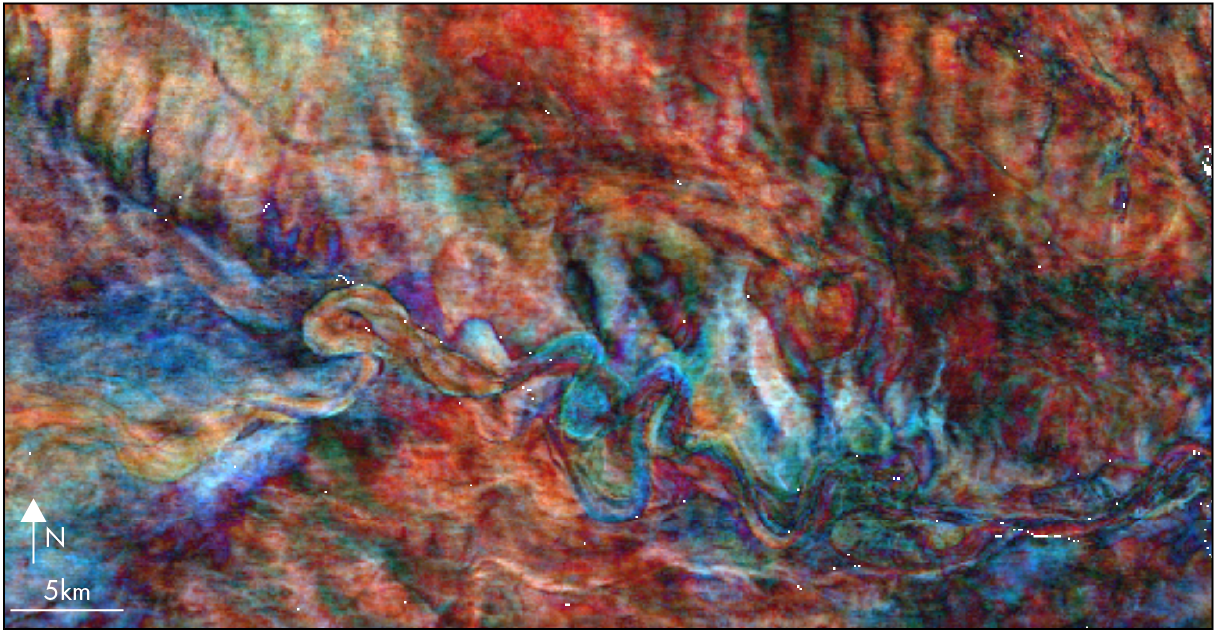 Figure 3: Spectral Decomposition (Near Stack volume from Geoex MCG) from the Cretaceous Sequence around EG-18 showing meandering, avulsing channels (70 km length) and submarine fan complexes (Red 10 Hz, Green 20 Hz, Blue 31Hz).