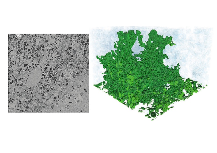 Simulation of tracer flow through Edwards White (outcrop) carbonate. The sample is somewhat heterogeneous, as indicated in the 2D cross-section of a microCT scan (left). A tracer test, shown at first breakthrough of the tracer, also indicates a high degree of heterogeneity in the flow (right). (Source: Image courtesy of Schlumberger)Widely recognised components of routine physical core analysis, combined with the latest in digital analysis technology, comprise the earliest stages of the process that culminates in DHD simulation. These different working parts — whole core X-ray computed tomography (CT), micron-scale CT (microCT) imaging, and focused ion beam scanning electron microscopy (FIB-SEM) — can be integrated rapidly to produce an actionable digital rock model. Analysis that previously took weeks or months can be completed in hours or days. Having the power to leverage a working model, one which analyses both rock and fluid properties and involves both physical and digital interpretation, puts operators in a position to better plan for a range of reservoir engineering strategies.
