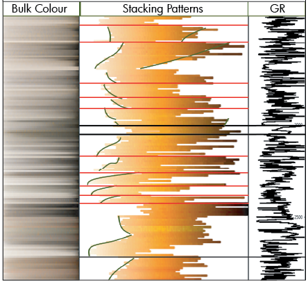 “Well log correlation and identification of sequence stratigraphic boundaries forms yet another application of the way colours can be used now,” concludes Simon. He points to a Gamma-ray log showing what looks like a fairly homogeneous succession, until the colours are plotted alongside, showing a clear trend at a certain position in the well that now turns out to be a maximum flooding surface. “It adds another useful tool to apply sequence stratigraphy and better predict facies changes away from the well.”