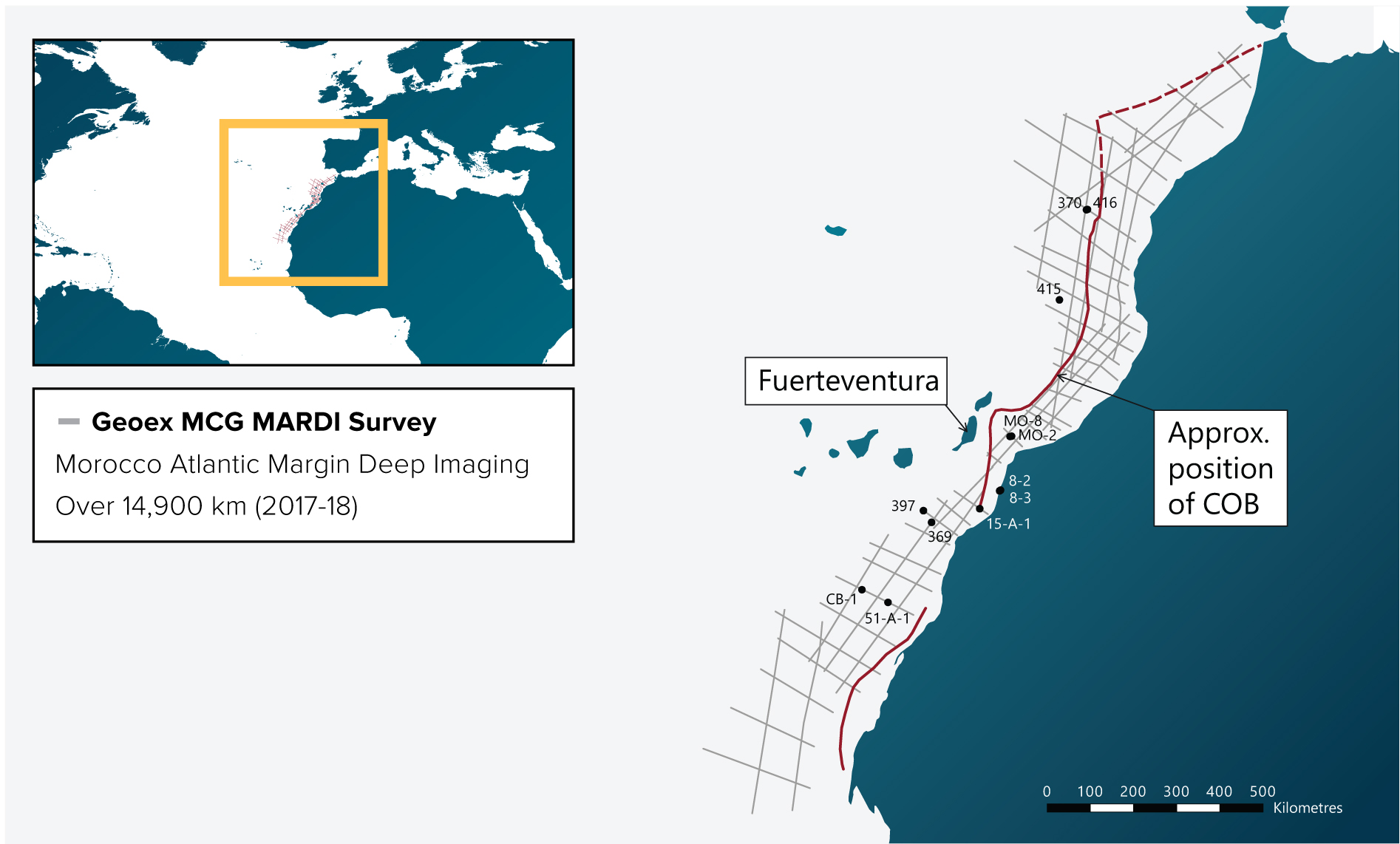 Geoex MCG’s MARDI survey – regional, long offset, deep imaging tying 37 wells offshore Morocco. Key wells for this article have been highlighted.