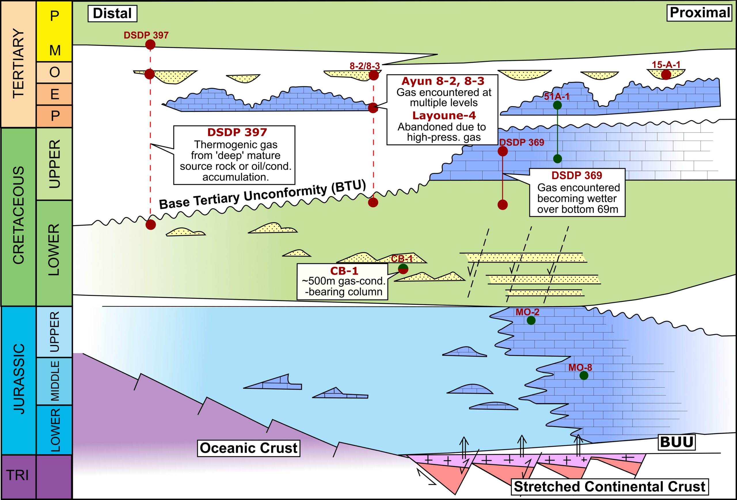 In the DSDP coreholes, ~30Ma of missing section was observed and, in some locations, even greater time hiatuses were encountered measuring at ~100Ma. Furthermore, AFTA and VR results indicate that the intervals below the BTU were hotter in the past compared to present day when evalu­ated against a continuous geothermal gradient. This has positive implications for source rock maturity on oceanic crust offshore Morocco whereby the Jurassic system was active prior to the uplift and creation of the BTU.