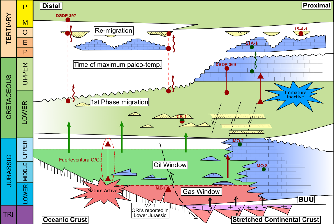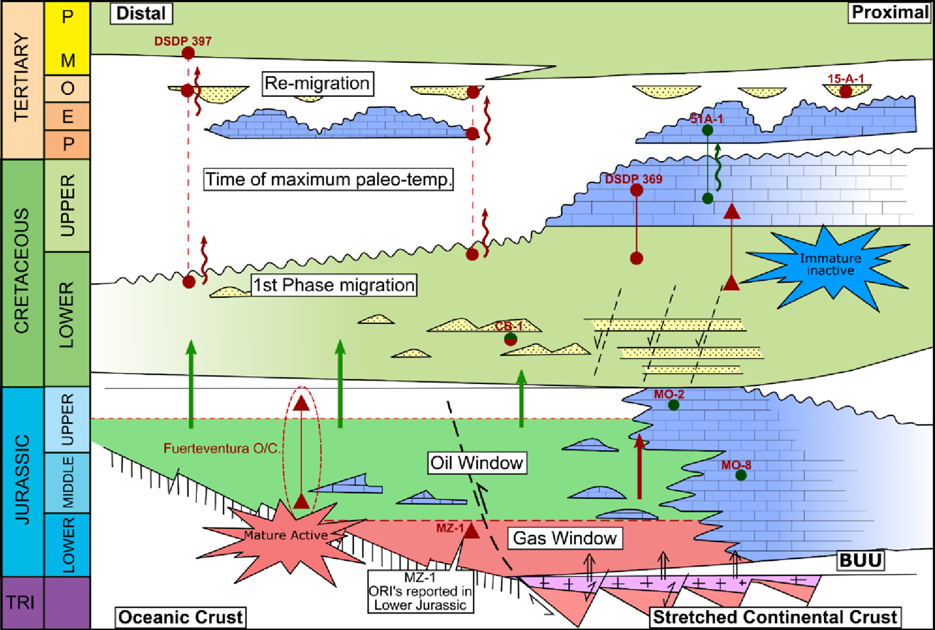 With source rocks in the Jurassic somewhat established, further consid­eration regarding how these source rocks have positively contributed to the petroleum system is evaluated. Given the evidence presented in this article, particularly by DSDP 397, Tertiary reservoirs can only be charged by hy­drocarbons re-migrating from deeper accumulations. This is evidenced in the form of DHI’s that indicate hydrocarbons are seeping across the BTU and charg­ing Tertiary reservoirs where available (termed re-migration on Figure 3).