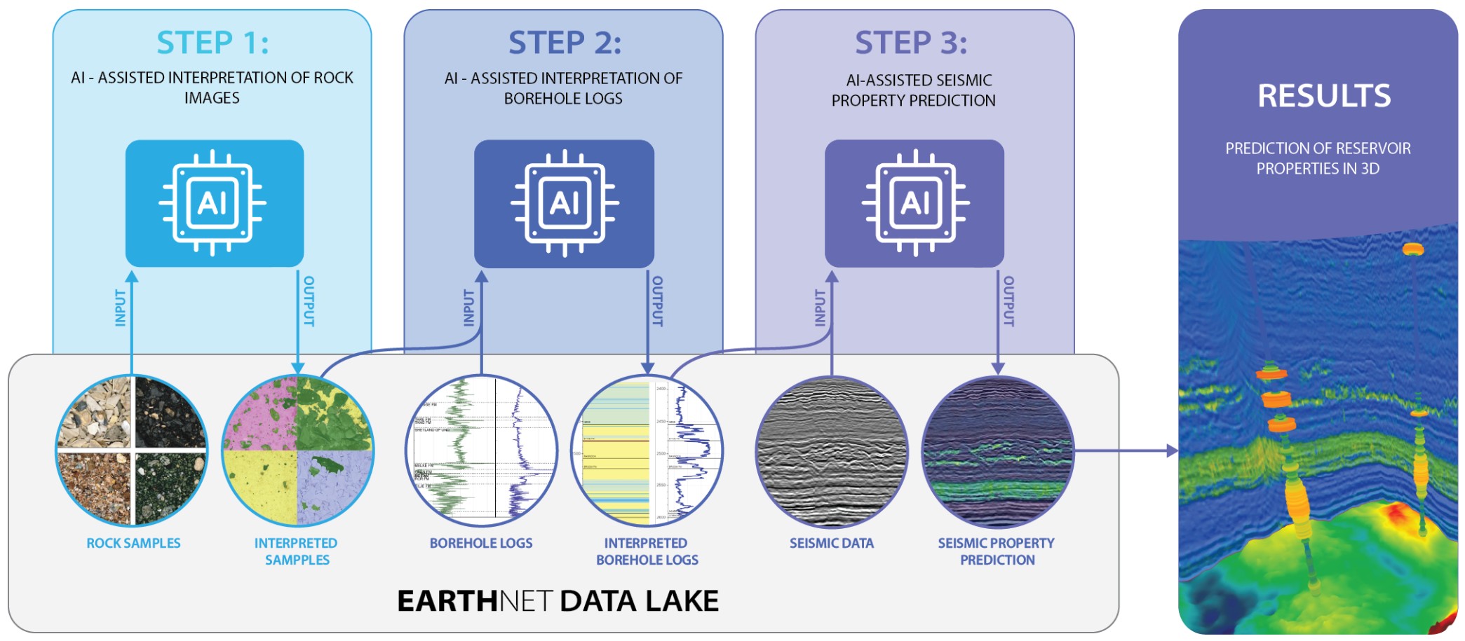 Figure 4 : EarthNET enables large-scale integrated workflows. This example illustrates a multi-model AI workflow for integrating subsurface data at scale, from rock samples to basin-scale seismic-based rock property prediction. Nguyen et al. (2023).