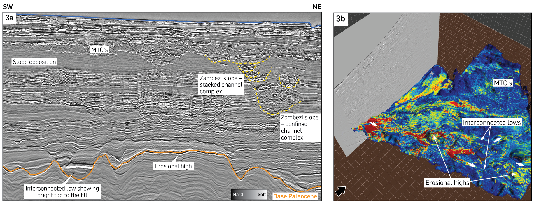 The Paleocene Upper Grudja formation is considered to have reservoir potential with sedimentation occurring largely within a slope setting. The Upper Grudja formation within the southern part of the survey area is characterised by migrating channel levee complexes indicating synchronous interaction of downslope-flowing turbidity currents and along-slope contour currents (hybrid channel systems). These hybrid channel systems were strongly controlled by the position of the pre-existing Upper Cretaceous contourite drifts and moats. The reservoirs consist of thick channel deposits (Figure 3a) with potential vertical connectivity. An RMS map of the Base Paleocene (Figure 3b) shows the distribution of potential reservoir sands, some of which exhibit a high-amplitude response within the connected lows of the hybrid channel systems in the south of the survey. These reservoirs are sealed by fine-grained clastic slope deposits. Hydrocarbon charge is likely to be from Early Cretaceous (Aptian-Albian) and Late Cretaceous (Turonian-Coniacian) source rocks. Traps are stratigraphic and consist of truncations, onlap and ponding within the lows of the channel systems.