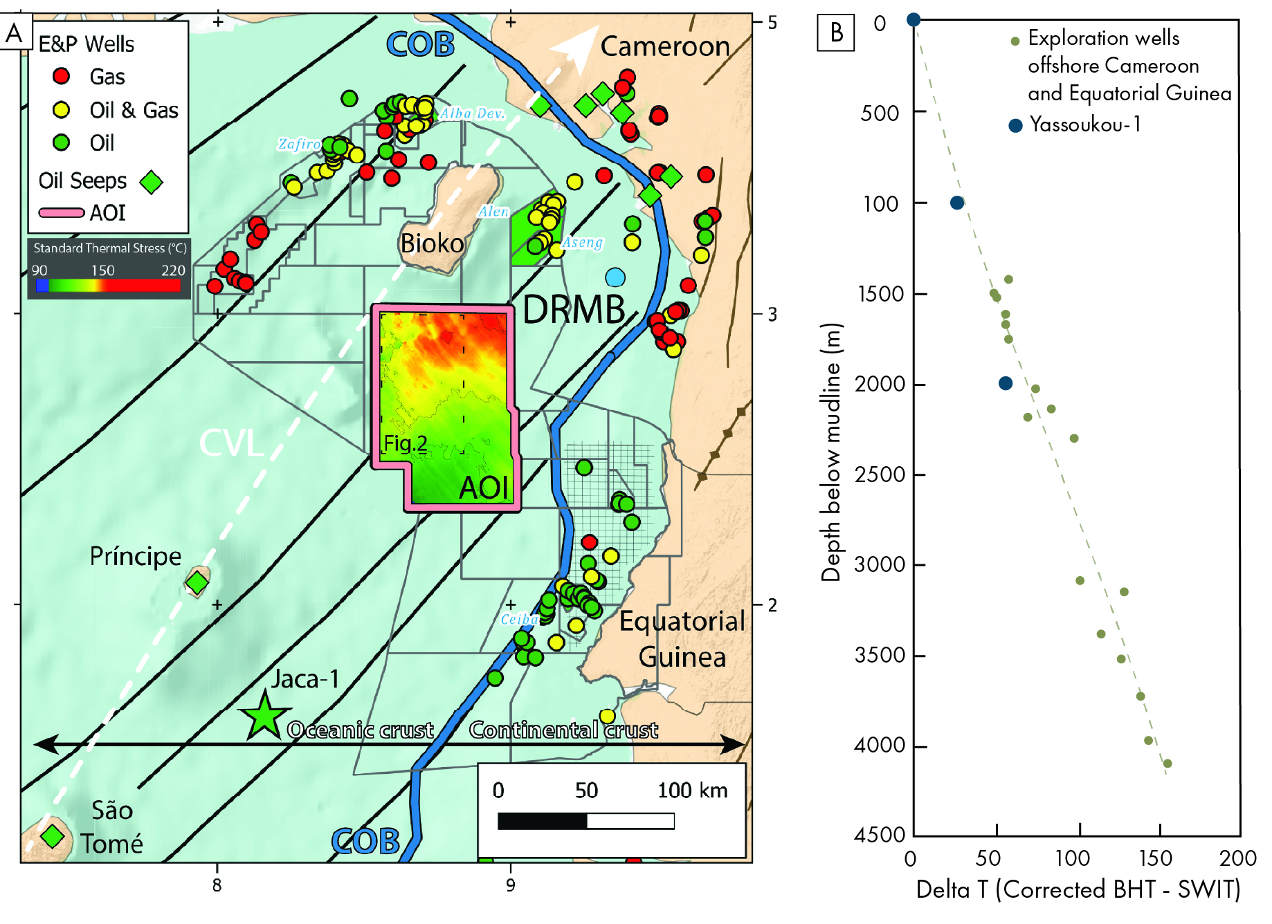 Figure 1A: Detailed map of the study area showing exploration and production blocks, exploration wells, and the distribution of oil and gas seeps in the deepwater Douala–Rio Muni Basin (DRMB). 3D models completed using the software ExCaliber are shown for the area of interest (AOI). COB, Continental-oceanic boundary. B: Corrected bottom hole temperatures (BHTs) plotted as ΔT versus depth below mudline, illustrating regional geothermal gradient trends. Well data shown in Figure 1 were provided courtesy of CGG Services (UK) Ltd (part of the Viridien Group). For data access and licensing of the Viridien GeoVerseTM database, contact GeoVerse.Support@viridiengroup.com.