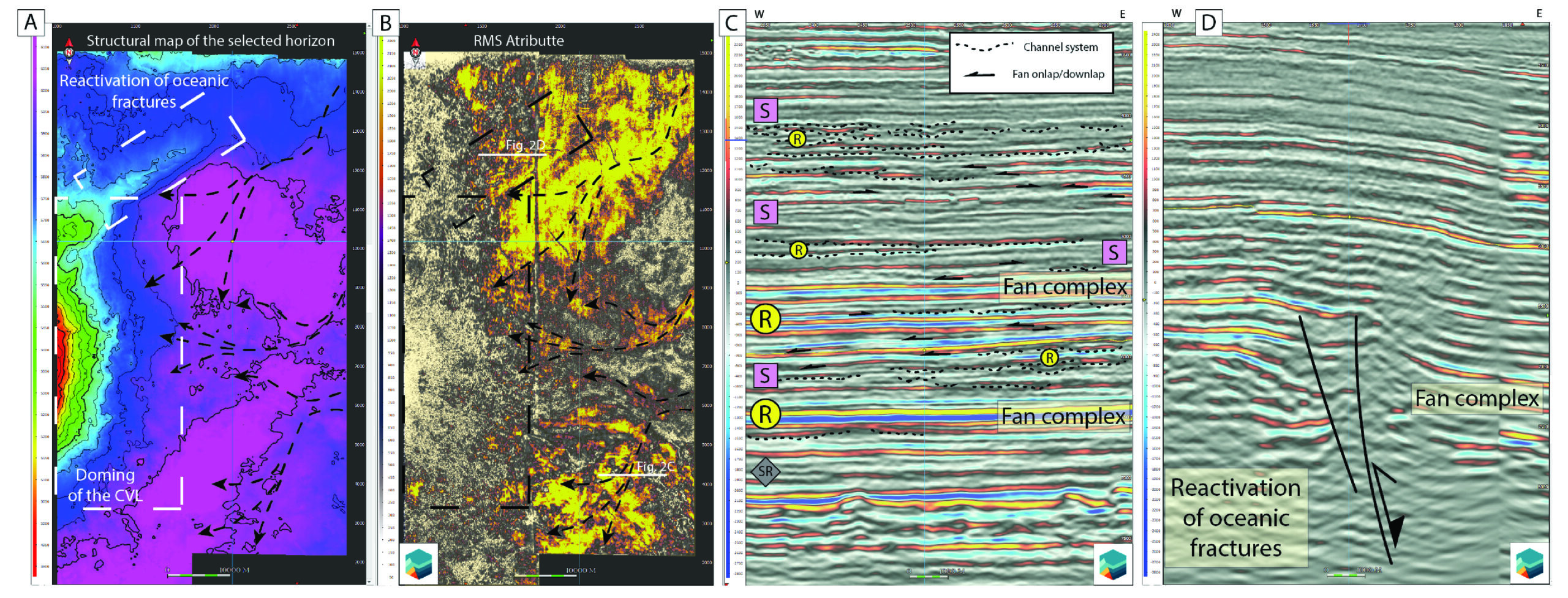 Seismic interpretation al­lowed the extraction of key attributes (RMS, sweetness) to identify deepwater fans and play fairways within the Albian-Campanian interval. In particular, the Santoni­an-Campanian channelized turbidites and basin-floor fans capped by thick mud­stone packages form stacked reservoir-seal pairs. In several areas, these systems are folded or uplifted as a result of vol­canic doming along the CVL. Such structural overprints also create combination traps as a potential drilling target.