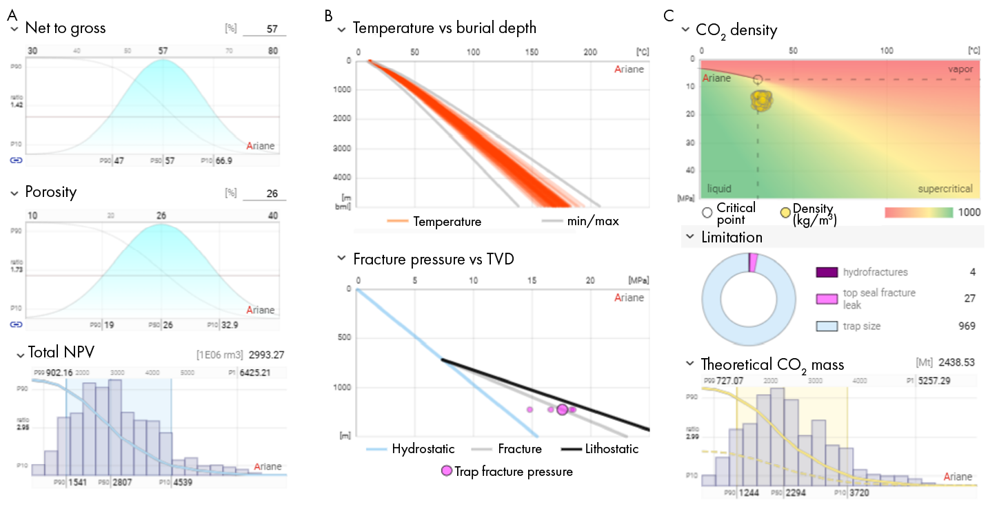 Figure 2 illustrates the workflow for Prospect 5, showing the parameterisation of key Monte Carlo simulator inputs and predicted outputs. The analysis focuses on the theoretical storage resources, based on net pore volumes (NPV), which are dependent on the size of the trap and the proportion of reservoir rock and the porosity (Figure 2A). The thermal model uses a mean geo-thermal gradient of ~31° C km-1, consistent with regional constraints (Muñoz-Cemillán et al., 2025), and a surface temperature of 11.8° C, averaged from the CTD data within the study area (EMODNet). Hydrostatic pressures at the crest of the prospects vary between 9 and 14 MPa. To account for potential overpressure fracturing, a fracture gradient is applied (Figure 2B). Figure 2C shows that Prospect 5 carries some risk of liquid CO₂ under lower than average geothermal gradients, a very small risk of top seal leakage, and substantial theoretical resources (p50 of ca. 2.3 Gt of CO2).