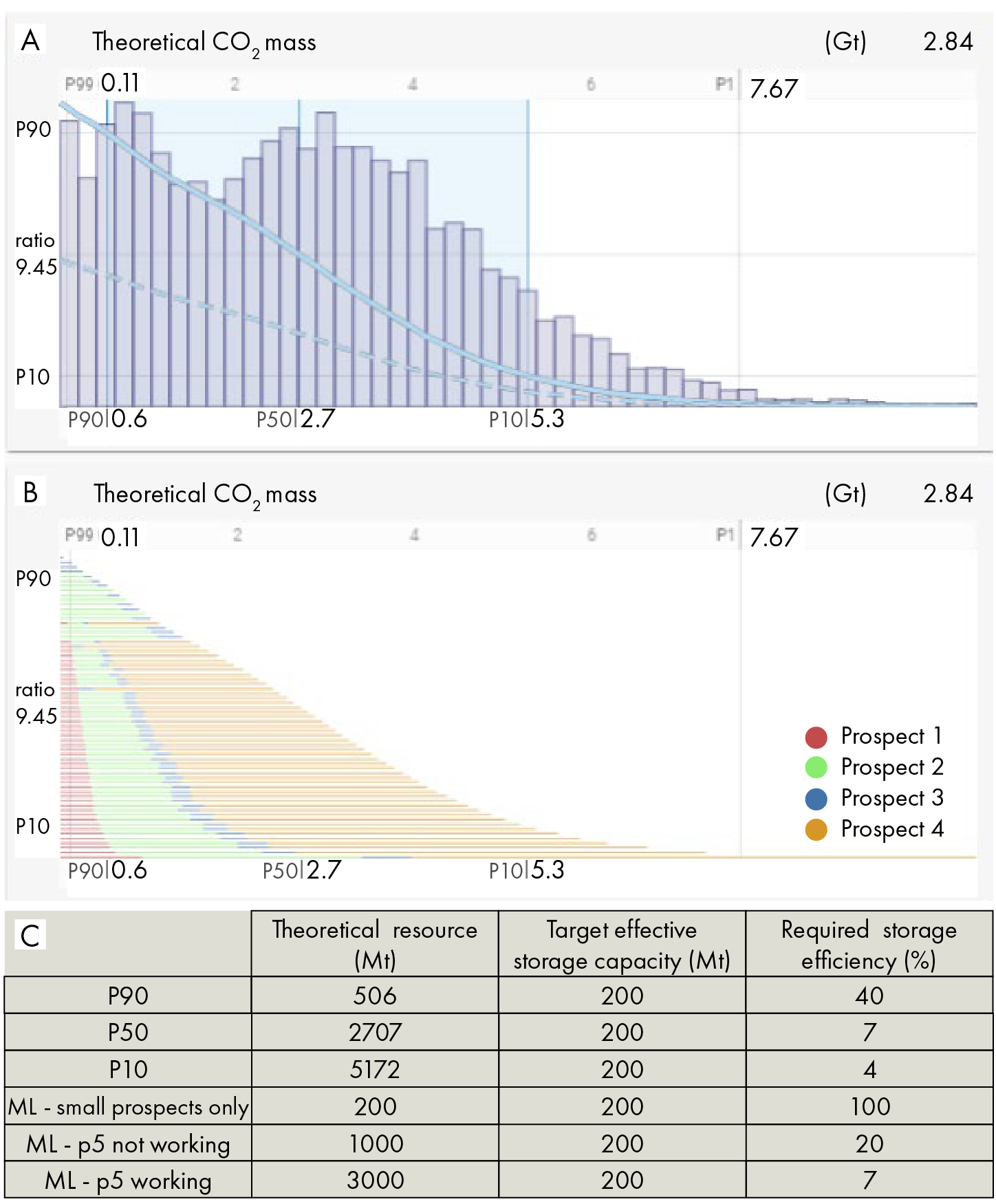 Prospects 1, 3, 4 and 5 have been combined to estimate the range of possible theoretical resources for the entire block. A probabilistic aggregation of multiple prospects consists of calculating both risk and success case CO₂ masses as part of an interdependent co-simulation of all individual prospects. These prospects can be related to each other via risk dependencies: If one prospect succeeds, other dependent prospects are also likely to succeed, and volume parameter correlation (e.g. porosity, NTG).