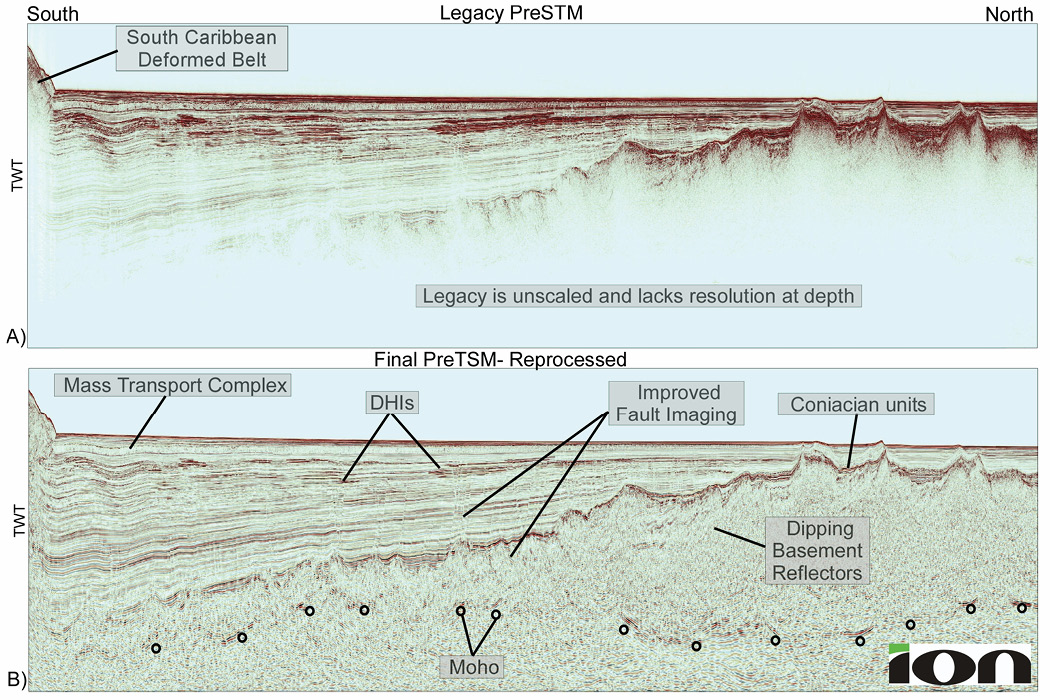 Included in the processing uplift is a clear basal-stratigraphic-unit/basement interface. This contact boundary is critical to understanding the Caribbean region, as nearly all of the CLIP is capped with volcanic flows related to the Galapagos Hotspot interaction in the Pacific Ocean.