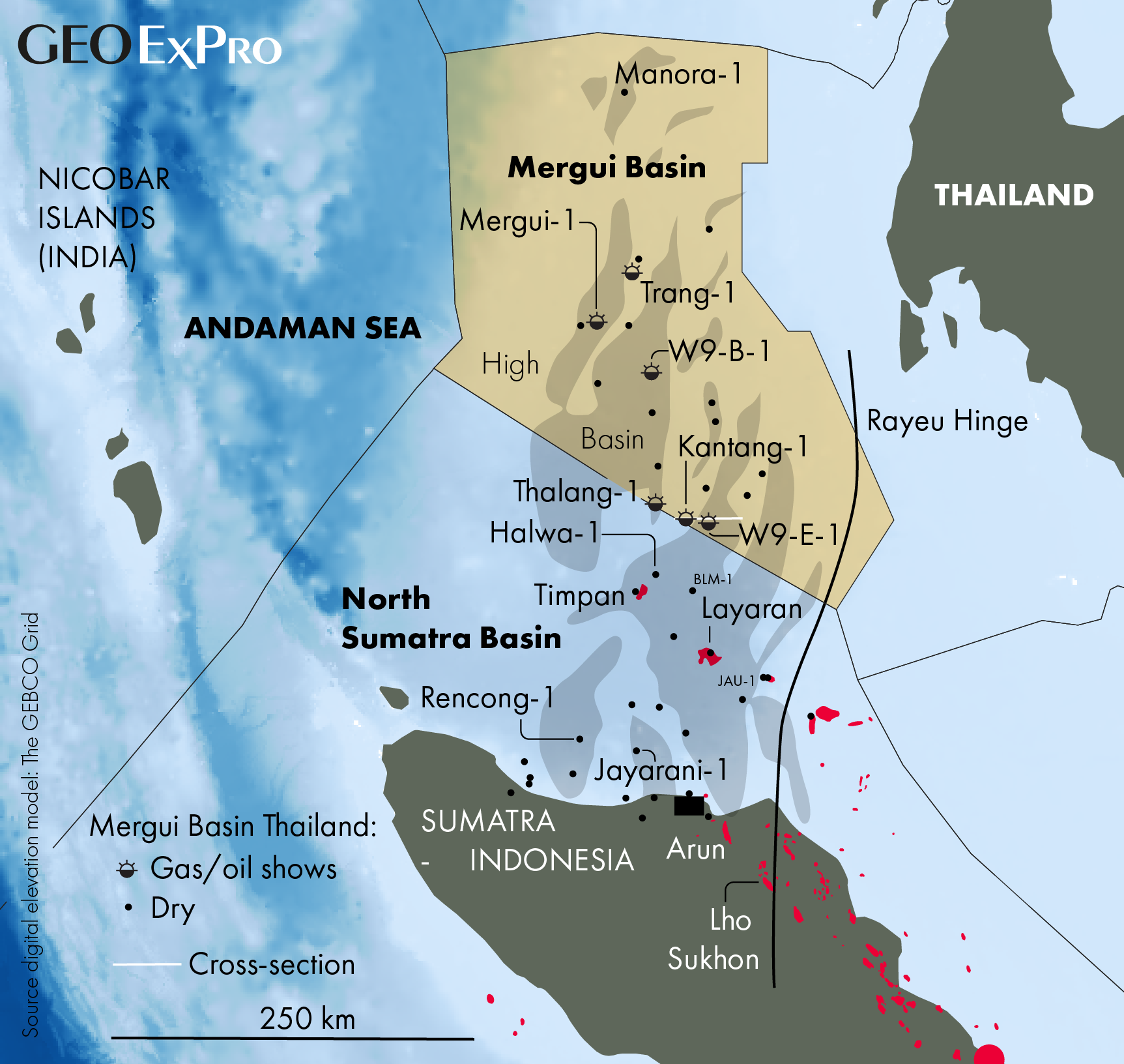 The Thailand Department of Mineral Fuels has just announced a licence round in the Mergui Basin, Andaman Sea. Interestingly, they have decided to license the area as a single massive block covering 60,288 km2 in water depths that range from 400 m to around 2000 m. The block encompasses all nineteen of the exploration wells drilled to date. Three of these wells were drilled in water depths of around 1000 m, four in 750-1000 m and the remaining 11 in 400-750 m of water. This is largely a frontier region, and its licensing has been much anticipated following the recent large gas discoveries at Timpan, Layaran & Tangkulo to the south in deep-water offshore North Sumatra.