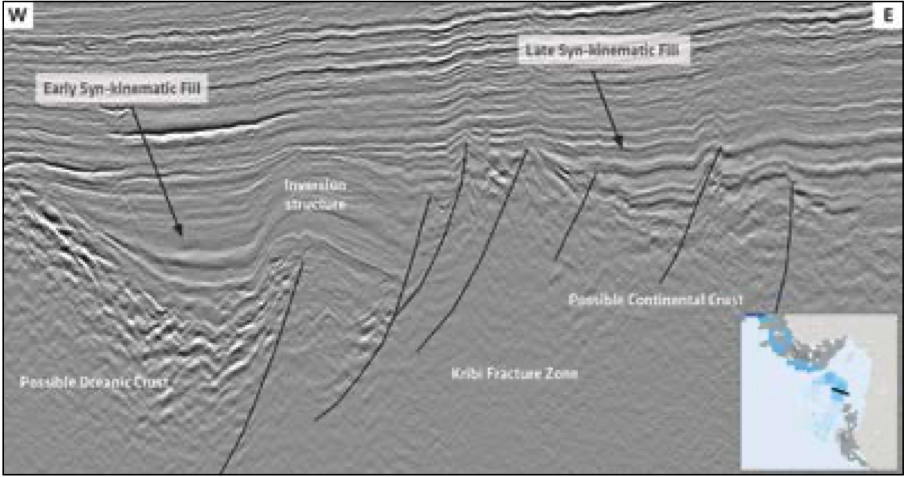 2002-acquired 2D seismic line through the Kribi Fracture Zone showing a possible boundary between oceanic and continental crusts, transform fault surfaces, early syn-kinematic sediments that have undergone inversion and then later syn-kinematic sediments.