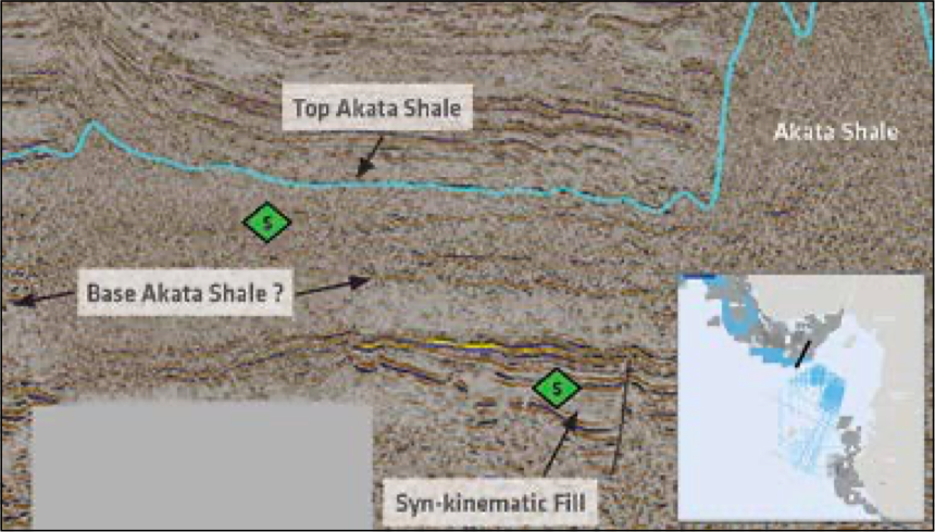 An arbitrary line through Nigeria and the JDZ showing the sub-Akata Shale synkinematic structure and stratigraphy. The potential for a sub-Akata petroleum system has excited Niger Delta explorers and operators.
