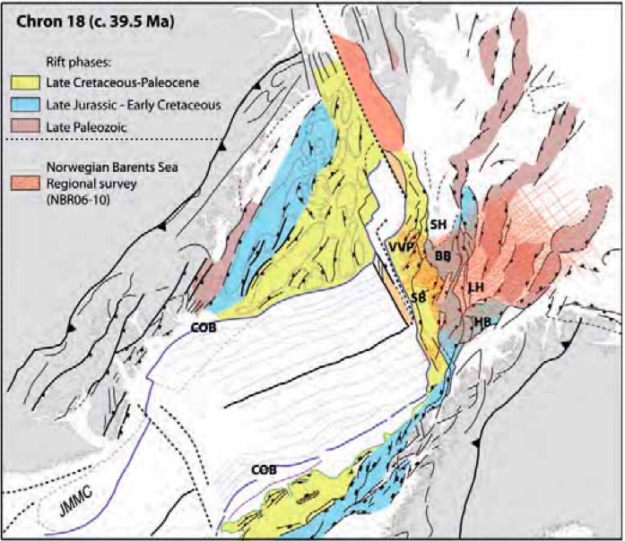 The Late Cretaceous/Early Cenozoic structuring and evolution of basins and marginal highs along the western part of the Barents Shelf were related to the opening of the Norwegian-Greenland Sea and the formation of the predominantly sheared western Barents Sea continental margin. The Vestbakken Volcanic Province and the northern part of the Sørvestsnaget Basin formed in a pull-apart setting related to the releasing bend at the margin, forming extensional faulting and local depocentre (Faleide et al., 1991, 1993). In this regime, lacustrine/restricted marine facies are prognosed, and under such conditions sediments with source-rock potential often develop (Rasmussen et al., 1995). Although non-commercial, the well 7316/5-1 located in the Vestbakken Volcanic Province proved the existence of minor gas accumulations in Middle Eocene submarine fan sandstones, and in this way, documented the existence of a Cenozoic petroleum play (Ryseth et al., 2003). On the other hand, the depocentre in the southern part of the Sørvestsnaget Basin is related to Middle-Late Eocene large-scale salt diapirism (Breivik et al., 1998), implying a different depositional setting. After the initial continental breakup and the onset of sea-floor spreading, the Vestbakken Volcanic Province and the Sørvestsnaget Basin subsided rapidly and received large amount of erosional products from the Stappen High to the northeast.
