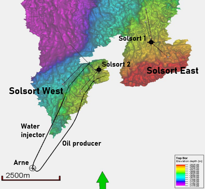 As expected, Solsort will be developed as a tie-back to the North Platform of the South Arne field. Ineos aims to drill two wells; a water injector placed in the northwest of the accumulation and an oil producer along the southeastern edge.