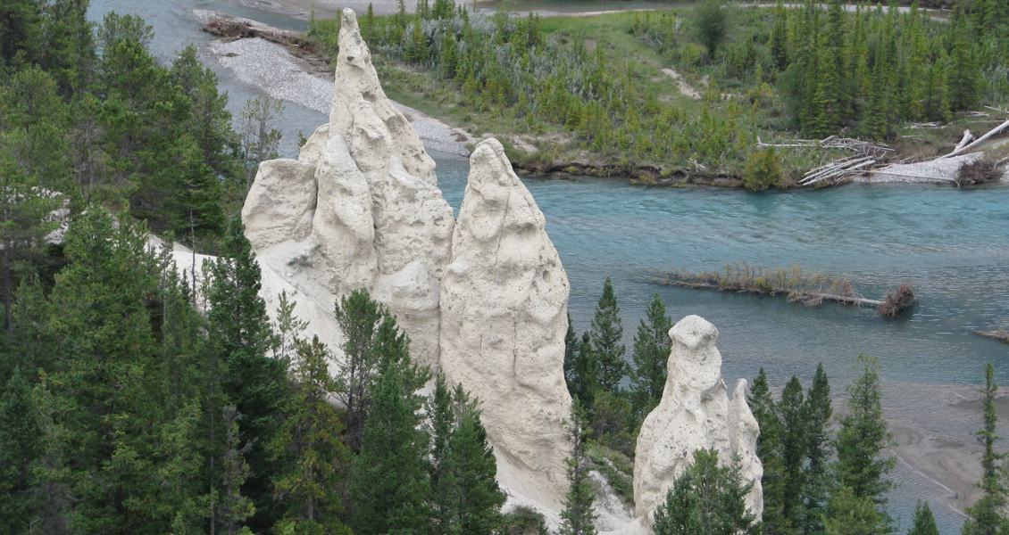 Continuing along the Bow River to the lookout point at the Banff Hoodoos, approximately a kilometer outside the town of Banff, one can see a thick section of glacial deposits in the valley. The current analysis suggests these formed from a debris flow created by a glacial ice dam from a valley in the area, which, as the ice receded, allowed for a Jokulhlaup-type debris flow. This flow is homogeneous in nature and similar to glacial till, but will also include some layering of lakebed alluvium: the layering indicates a debris flow rather than till, which would be completely homogeneous. As the river etched its way through the loose deposits the soft sediment eroded, but areas capped with harder rocks resisted erosion, resulting in distinctive pillar-shaped structures, known as hoodoos.