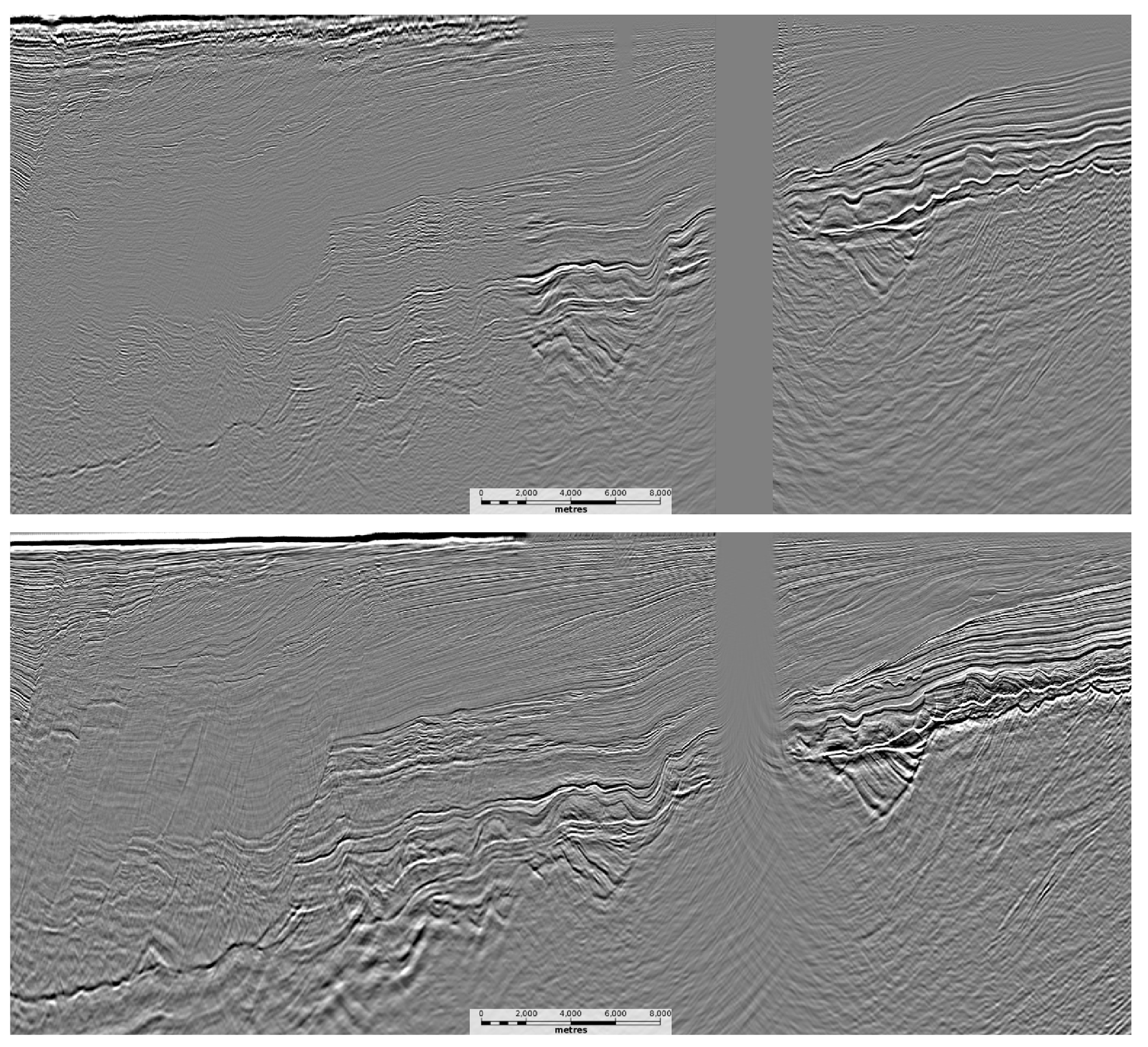 Streamer data reprocessing in-corporated bespoke noise attenuation workflows for each survey, deterministic source and receiver deghosting, plus extensive 3D SW-SRME, traditional 3D SRME and 3D muted SRME multiple modelling combined with adaptive subtraction techniques. Significant coverage gaps were recovered through 4D regularisation passes, and diverse azimuth imprints were suppressed by robust acquisition footprint removal.