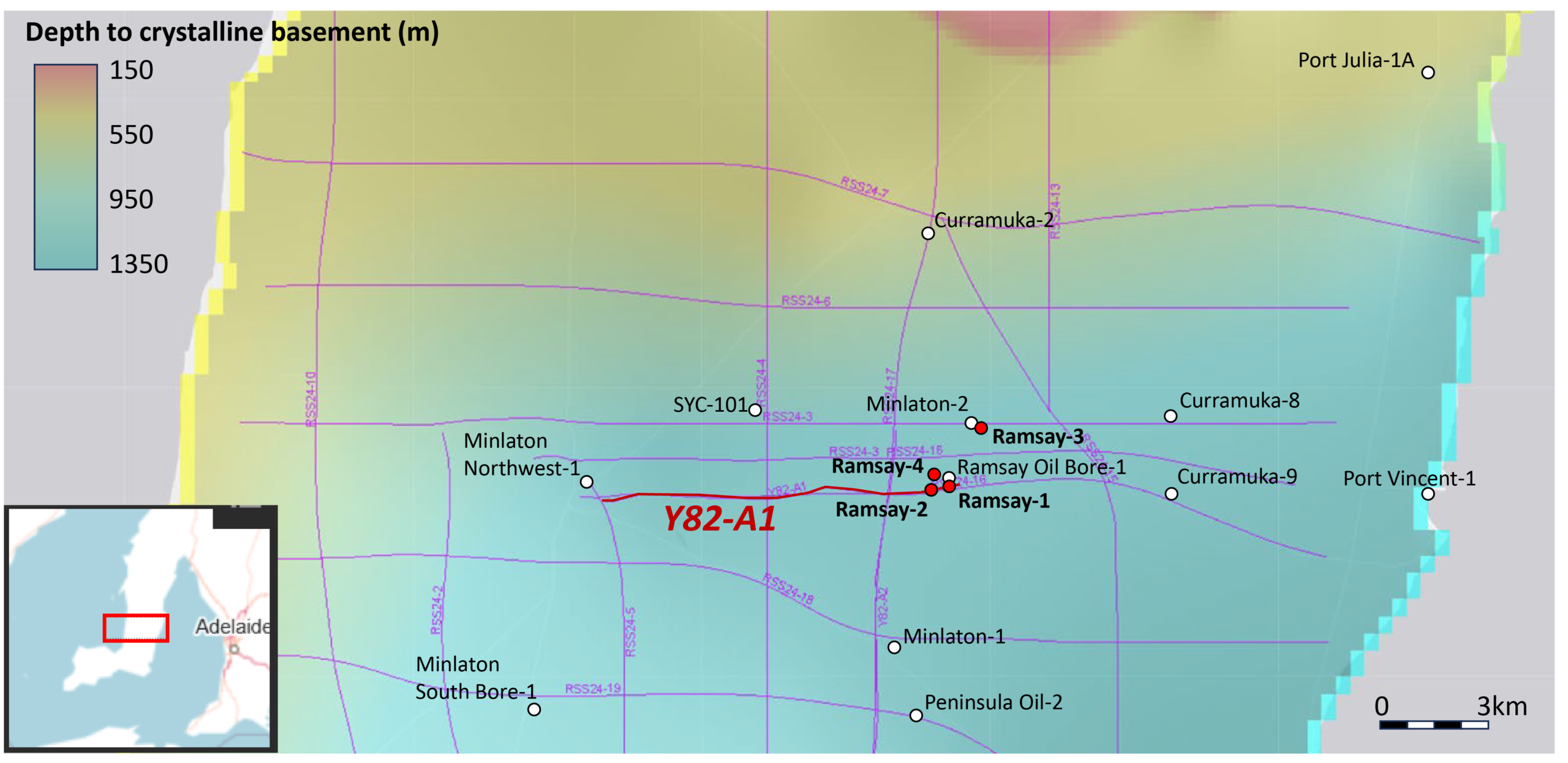 Figure 1: Map showing location of the Ramsay wells and 2D seismic lines. Source: South Australian Resources Information Gateway.