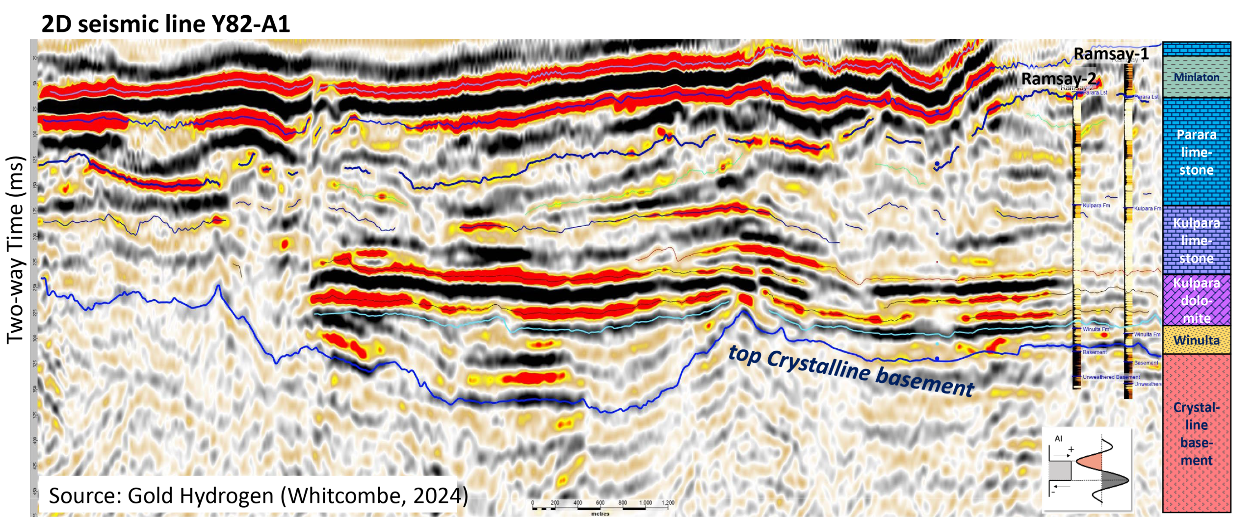 Figure 2: 2D seismic line illustrating geological setting of the Ramsay wells. Source: Gold Hydrogen (Whitcombe, 2024, modified).