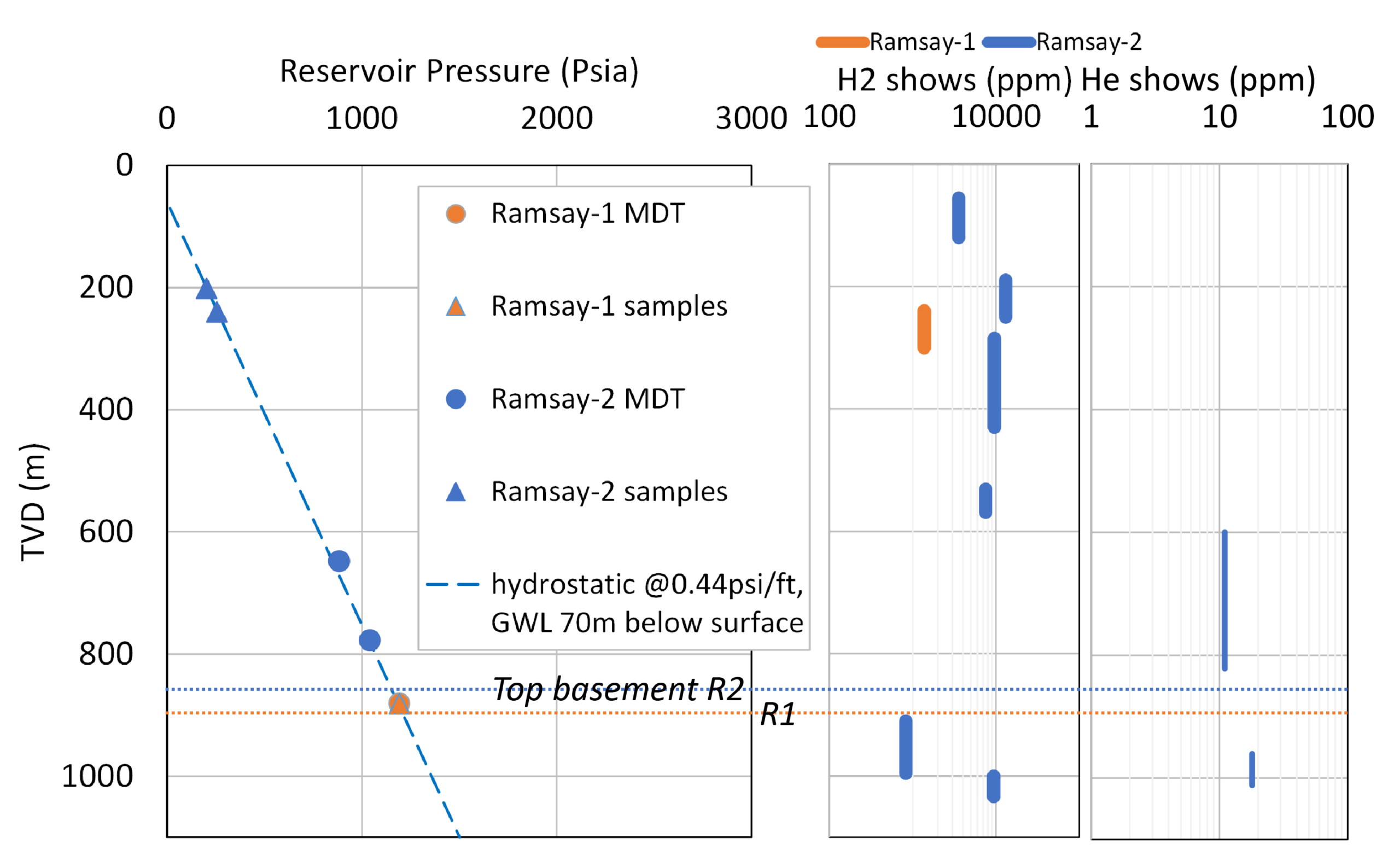 Ramsay-1 and -2 drilling are redrills of a 1931 well (Ramsay oil bore-1) where a “flammable gas”, subsequently identified as hydrogen, was reported. Ramsay-1 suffered total losses whilst drilling through most of the Cambrian and into the basement. Ramsay-2, drilled as a redrill of Ramsay-1 to obtain better gas-composition data, had only minor losses and good data throughout except for the shallowest section.