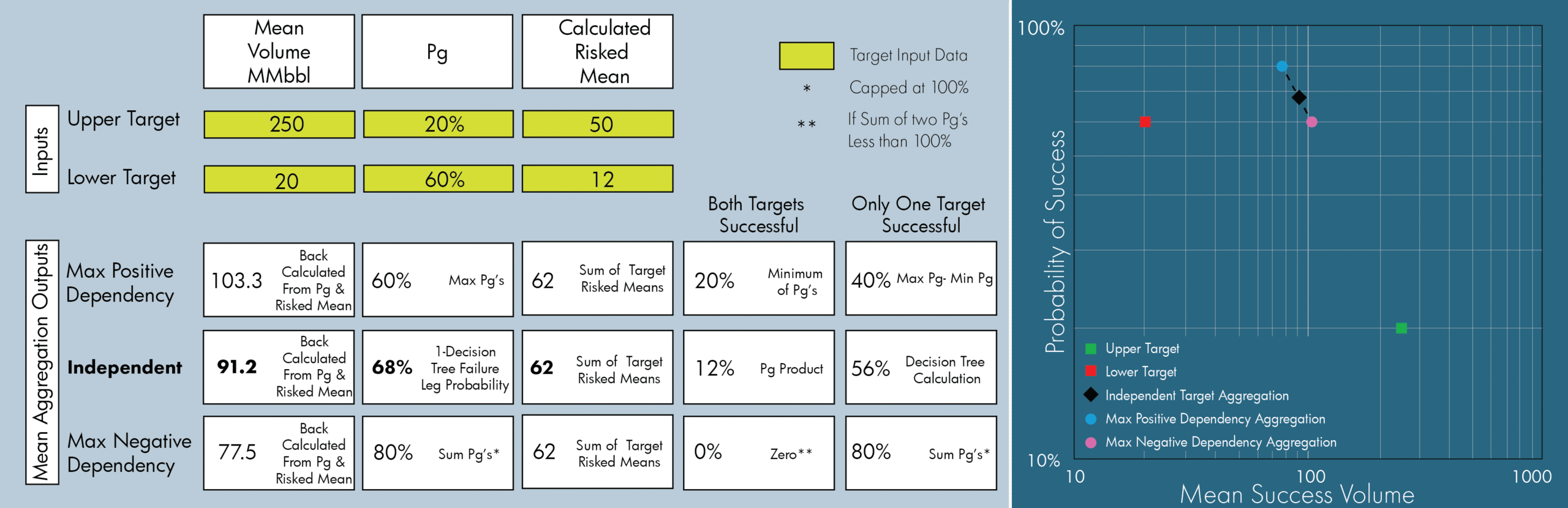 Frequently, explorers are surprised by the outputs from a Monte Carlo process when aggregating two targets. The trick to understanding the outputs of this process is to know that the mean of the aggregation calculation is equal to the sum of the risked means of the targets. This value will not change when dependency between the targets (positive or negative) is applied, as shown in the example below.