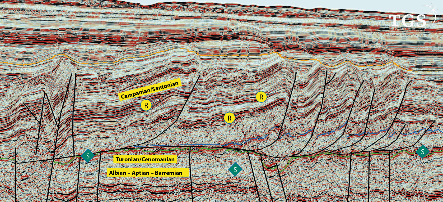 The seismic data reveals several large fold and thrust belts including a predominantly Tertiary fold belt, similar to offshore Mozambique in the Rovuma Basin. There is also an older Cretaceous fold belt involving Cenomanian to Maastrichtian shelf and slope sediments that have been thrust up and folded into a plethora of large anticline structures.